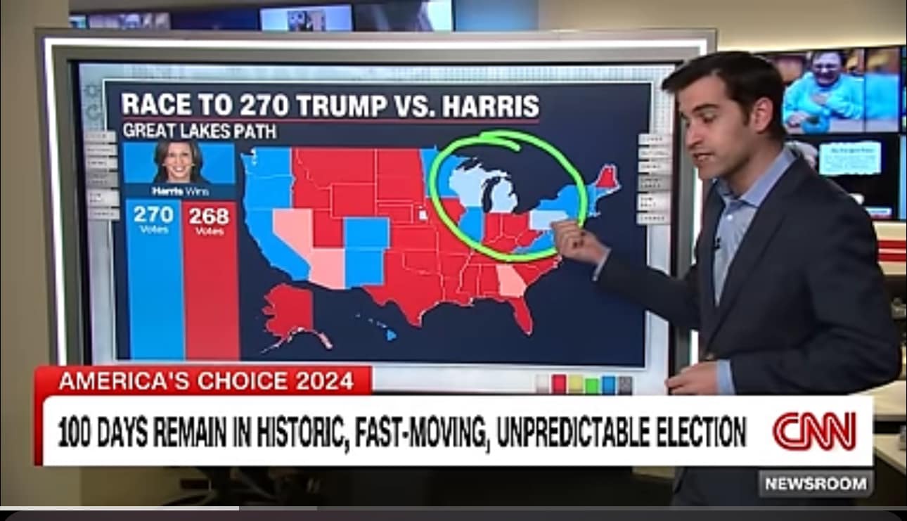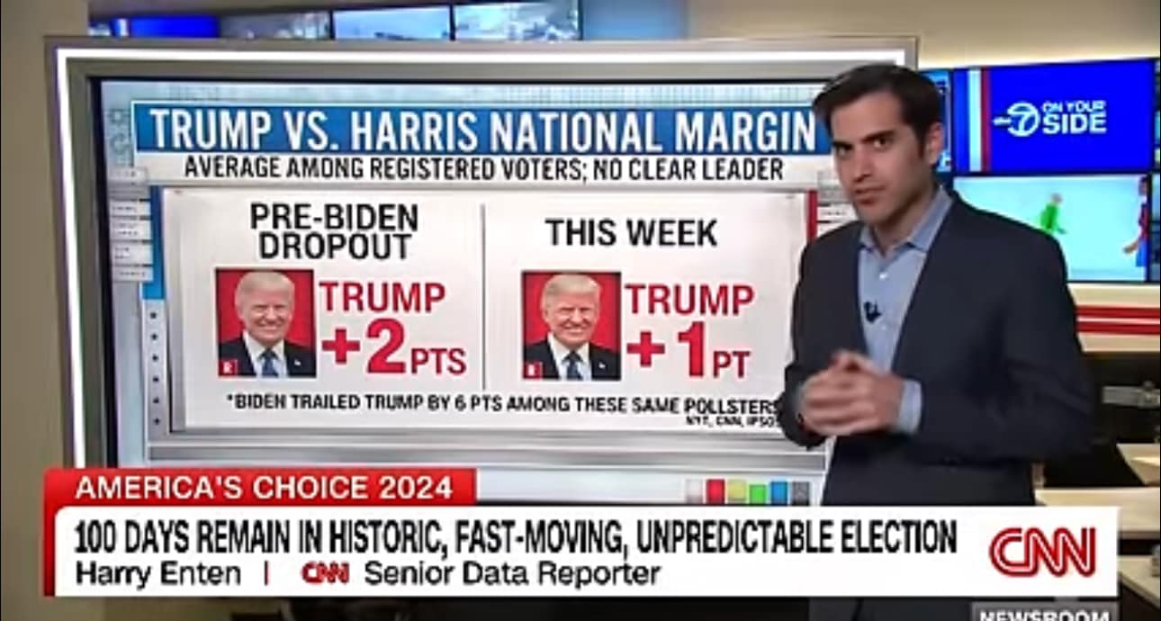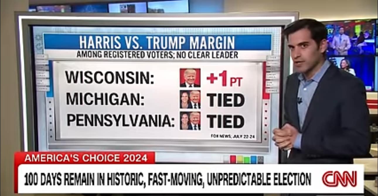 Вчора на CNN вийшов сюжет про 100 днів до виборів. Дата-аналітик ЗМІ вказує, що наразі немає чіткого лідера і що цього тижня Трамп виріс лише на один пункт. Цей один пункт у Вісконсіні, а Мічіган і Пенсильванія підвисли.