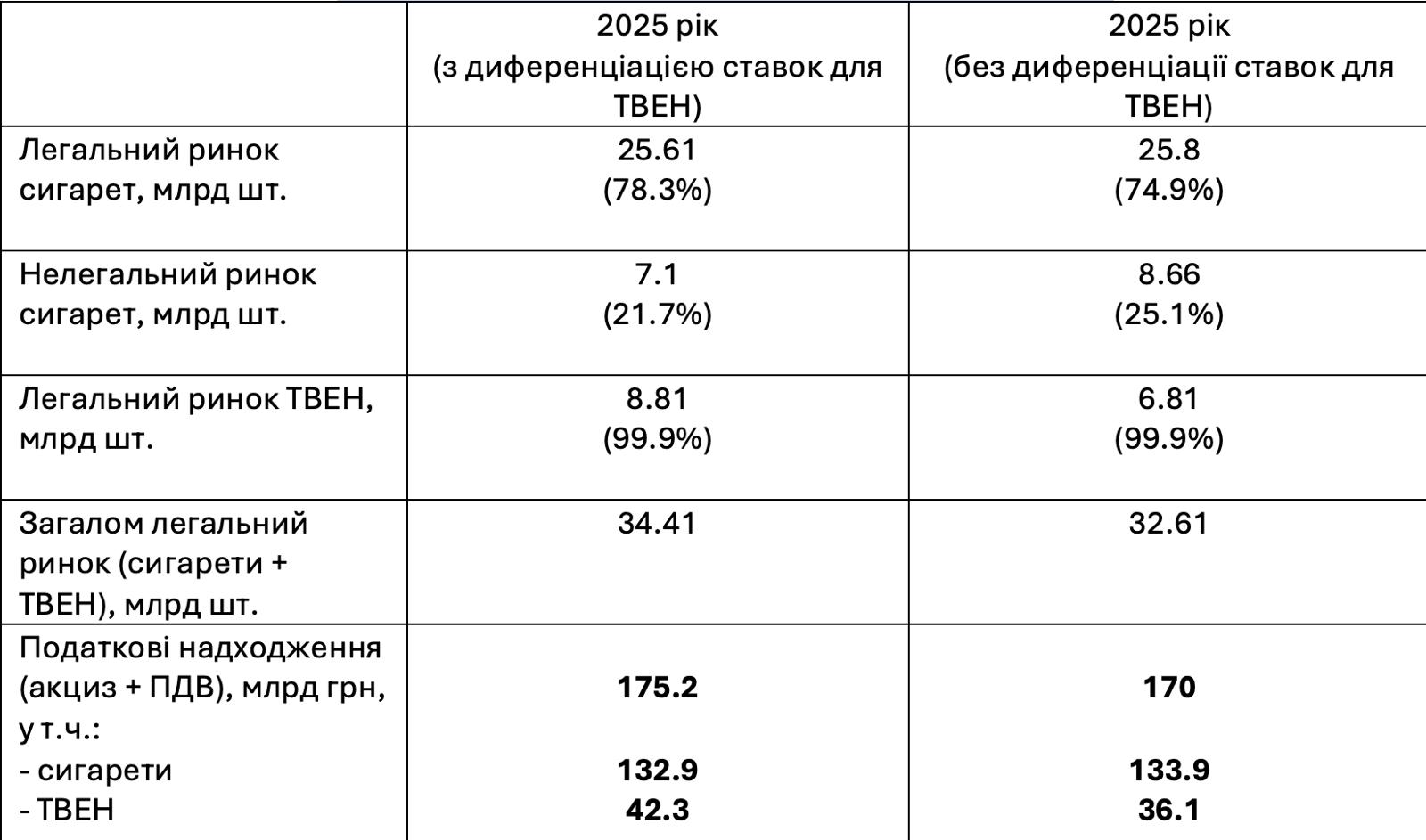 Таким чином, за умови диференціації ставок податкові надходження (акцизний податок, ПДВ та розрібний 5-% акцизний податок) до державного та місцевих бюджетів у наступному році мають бути більшими на 5.2 млрд грн від цих двох категорій тютюнових виробів порівняно зі сценарієм з однаковими ставками на сигарети та ТВЕН. Якщо екстраполювати застосований на 2025 рік метод розрахунку із застосуванням диференційованих ставок і на 2026-2028 роки, терміну, на який розрахований проект нового акцизного плану, то сума додаткових бюджетних надходжень сягне майже 21 млрд грн за 4 роки.