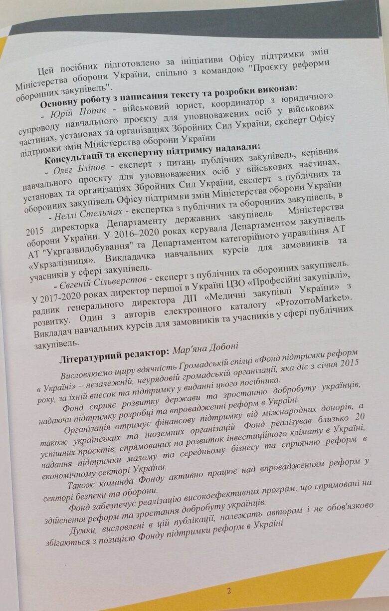 Книга - спільний продукт Проєкту реформи оборонних закупівель та Офісу підтримки змін Міноборони за сприяння Громадська спілка "Фонд підтримки реформ в Україні" та за підтримки спеціального радника Великої Британії з питань оборони.