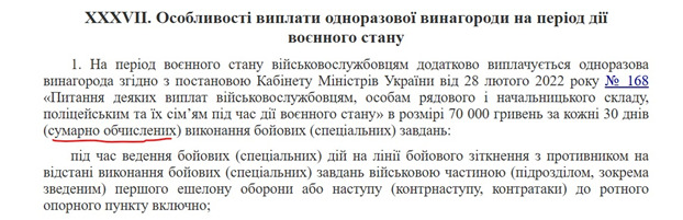 І тут звертаю увагу (і це є мета цієї публікації!) на проблемне питання щодо умов виплати одноразової винагороди в розмірі 70 тис. грн, яка запроваджена в першу чергу для піхоти, адже стосується тільки тих військовослужбовців, які виконують завдання на глибину ротного опорного пункту від лінії зіткнення. А саме, на незрозумілу умову виплати цієї винагороди: за виконання бойових завдань за кожні 30 днів "сумарно обчислених" (п.1., 37 розділ Наказу Міноборони №260). Тобто, якщо військовослужбовець виконував бойові завдання протягом 29 або меншої кількості днів і через поранення, травмування або інші причини не продовжить виконувати бойові завдання - він цієї винагороди не отримає і не отримає навіть частини цієї нагороди, пропорційно до кількості діб, протягом яких він був "на бойових".
