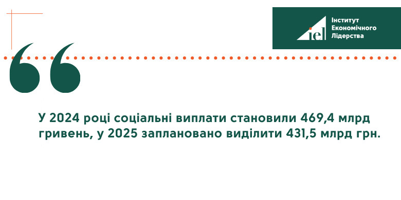 Протягом минулого року уряд неодноразово наголошував, що соціальні стандарти у проєкті бюджету на 2025 рік залишатимуться замороженими, оскільки їхнє підвищення потребує значного фінансового ресурсу. Це видається обґрунтованим кроком, враховуючи дефіцит бюджету та невизначені перспективи завершення війни. Соціальні виплати займають друге місце у структурі бюджету після витрат на оборону та безпеку. У 2024 році вони становили 469,4 млрд гривень, у 2025 заплановано виділити 431,5 млрд грн.