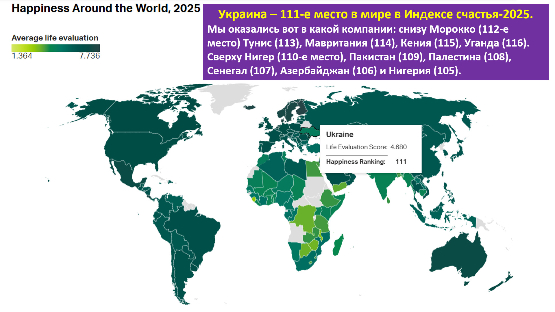 Украина заняла 111-е место в мире в Индексе счастья-2025. В прошлом году мы были на 105-м месте. Нет свободы (Украина на 150-м месте в Индексе экономической свободы), нет частной собственности (102-е место) – нет счастья. Мы оказались вот в какой компании: снизу Марокко (112-е место) Тунис (113), Мавритания (114), Кения (115), Уганда (116). Сверху Нигер (110-е место), Пакистан (109), Палестина (108), Сенегал (107), Азербайджан (106) и Нигерия (105).