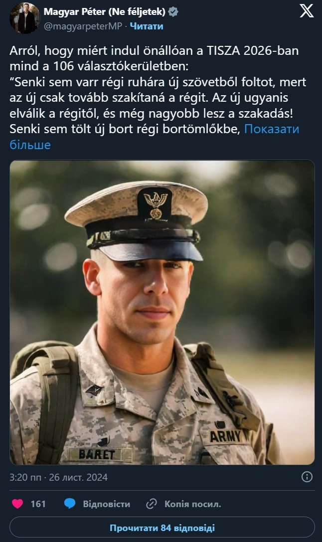 Попри це, опозиційний табір також не відмовився від ШІ-технологій. Сам Петер Мадяр визнав, що застосовував штучний інтелект у межах своєї медіастратегії. Одним із прикладів стала опублікована ним фотографія у військовій формі, створена за допомогою генеративних алгоритмів. Політик, однак, підкреслив, що етичне використання ШІ можливе лише за умови відкритого маркування контенту та поінформованості аудиторії про його штучне походження.