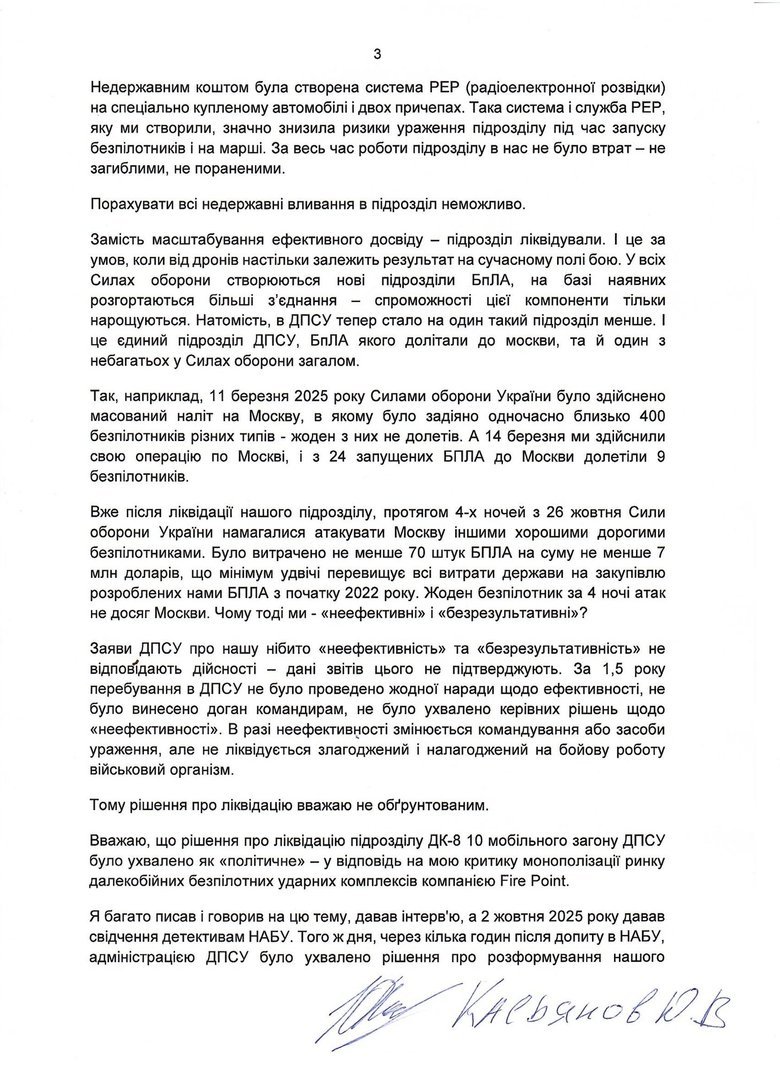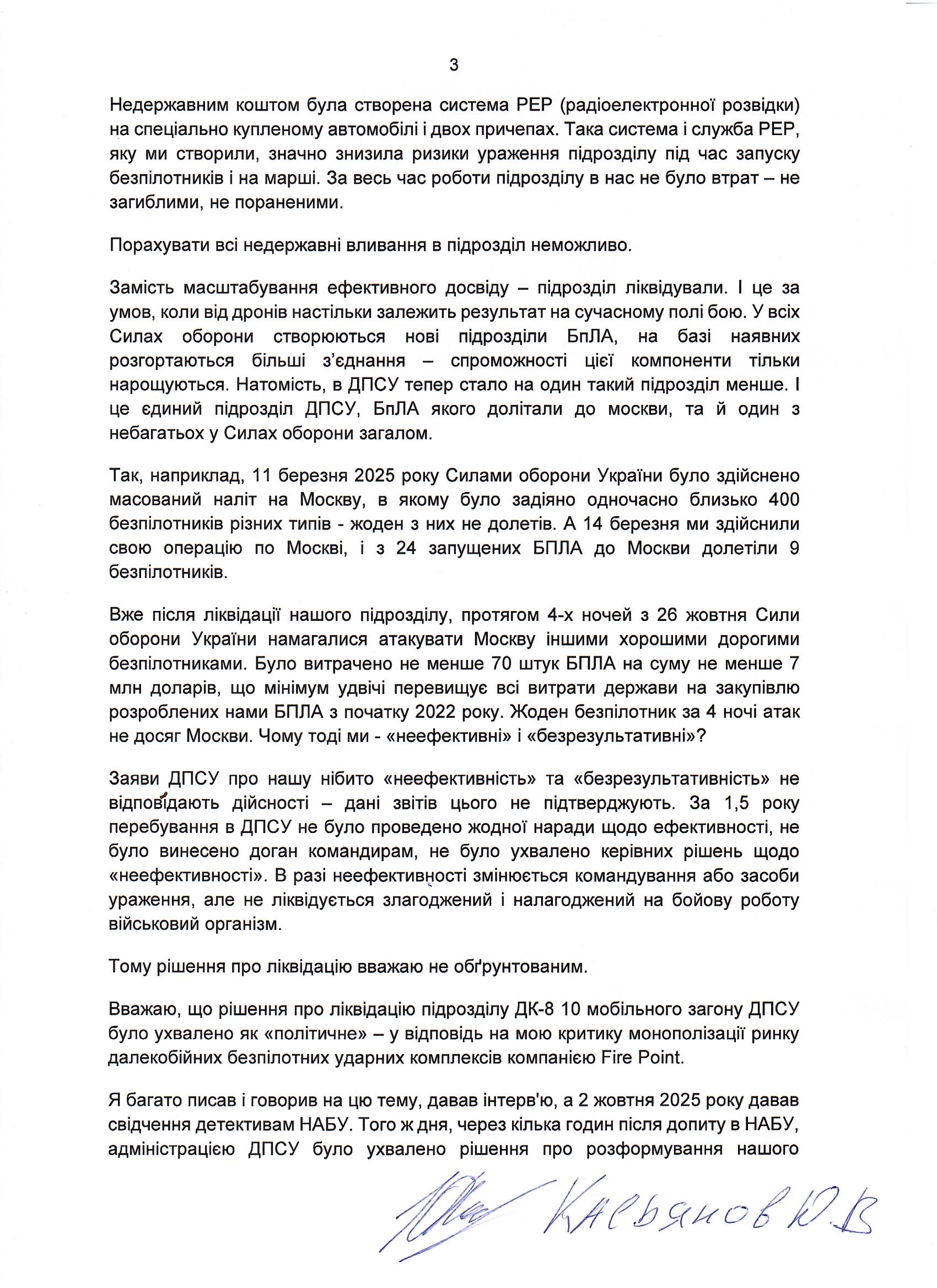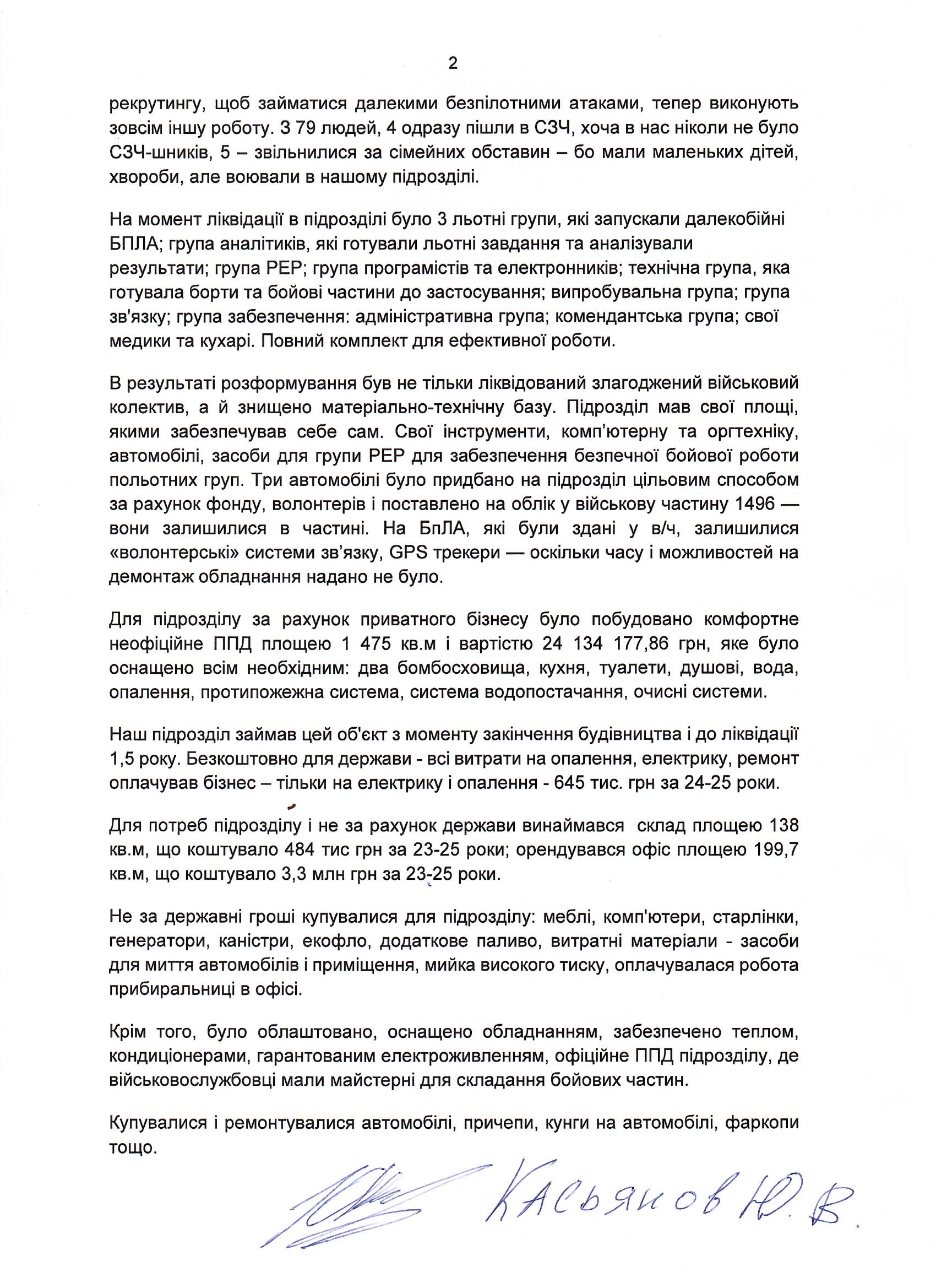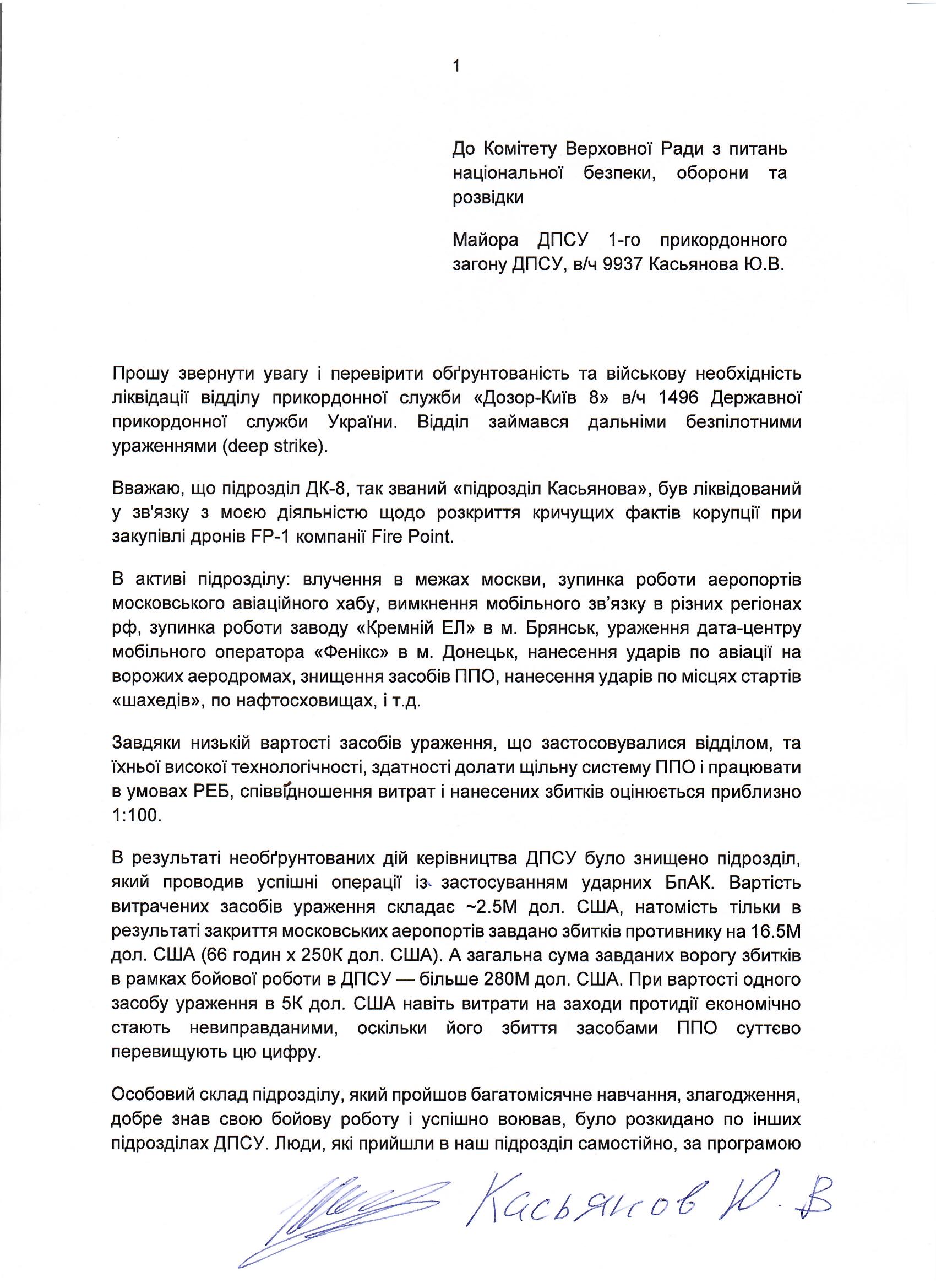 Вважаю, що підрозділ ДК-8, так званий «підрозділ Касьянова», був ліквідований у зв'язку з моєю діяльністю щодо розкриття кричущих фактів корупції при закупівлі дронів FP-1 компанії Fire Point.