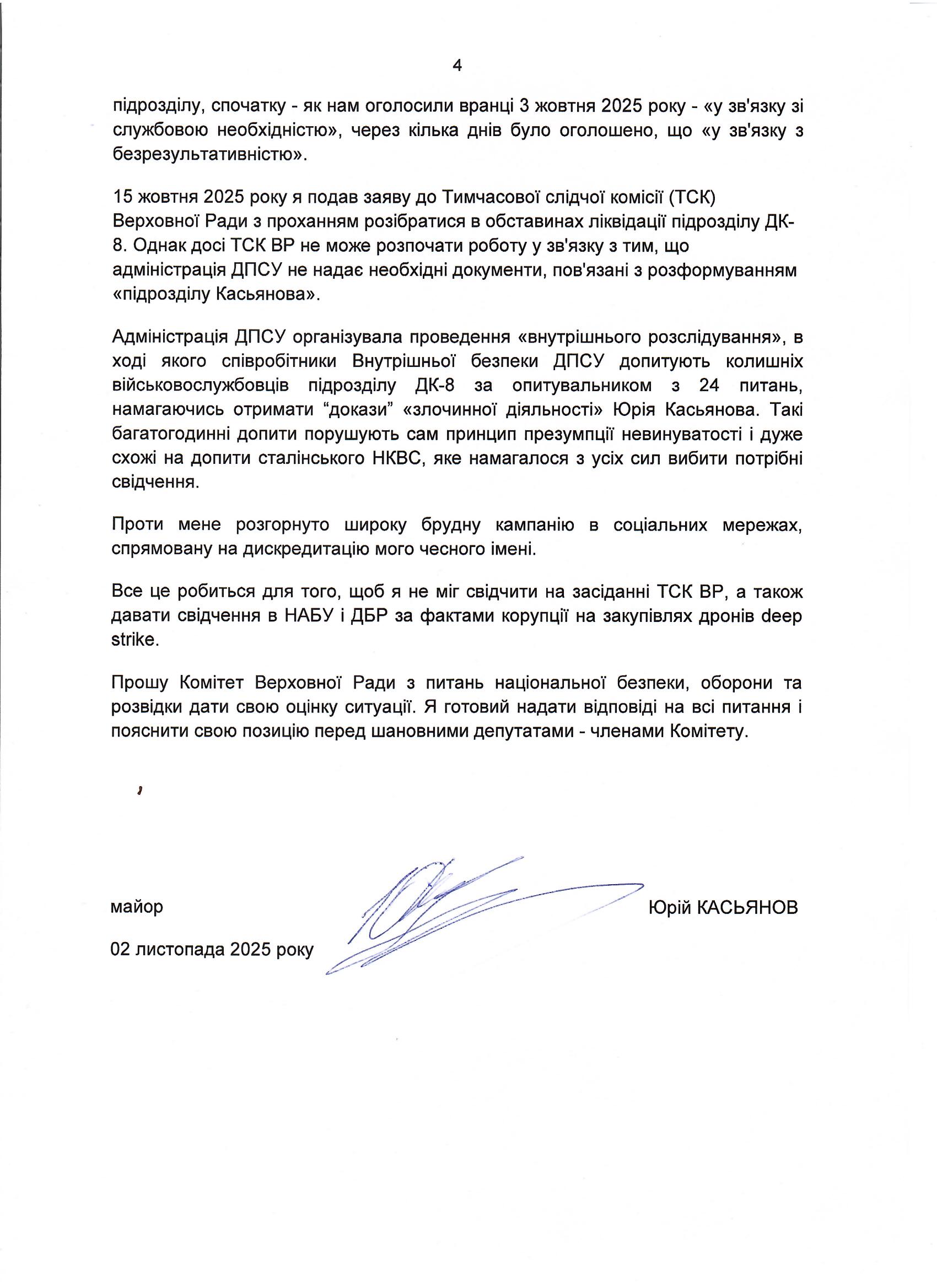 15 жовтня 2025 року я подав заяву до Тимчасової слідчої комісії (ТСК) Верховної Ради з проханням розібратися в обставинах ліквідації підрозділу ДК-8. Однак досі ТСК ВР не може розпочати роботу у зв'язку з тим, що адміністрація ДПСУ не надає необхідні документи, пов'язані з розформуванням «підрозділу Касьянова».