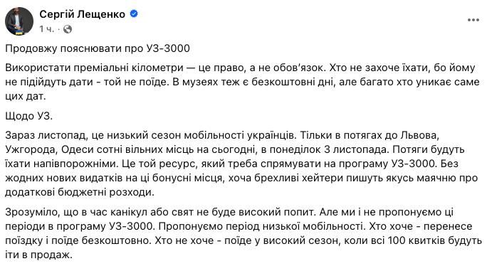 І ще про безкоштовність. У витратну частину обслуговання вагону входять не лише зарплата і ремонт, а ще: туалетний папір, миючі засоби, білизна, прибирання і т.д., Чи Лещенко вважає, що просто порожній вагон їде, а чистота сама стається і розхідники не витрачаються? Феєричний треш. Ну, і, наскільки я пам'ятаю порожнім потяг не відправляють, їздить менше вагонів, зайві відцепляють. Все одне робота УЗ - це не безкоштовний процес, а за все це треба платити. Платить бюджет, який наповнюємо ми з вами податками. Але схоже, що Лещенко про все це не знає, бо зайнятий вилізуванням обісравшийся дупи влади. Йому не звикати.