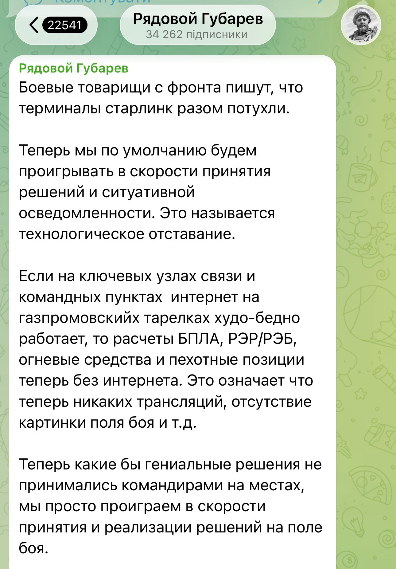 2. виходячи з близьких стосунків адміністрації трампа та кремля, цілком може статися, що за зверненням того ж дмітрієва-витькофа трамп вимагатиме від маска або покласти зв'язок й для наших СОУ або відновити його для росіян.