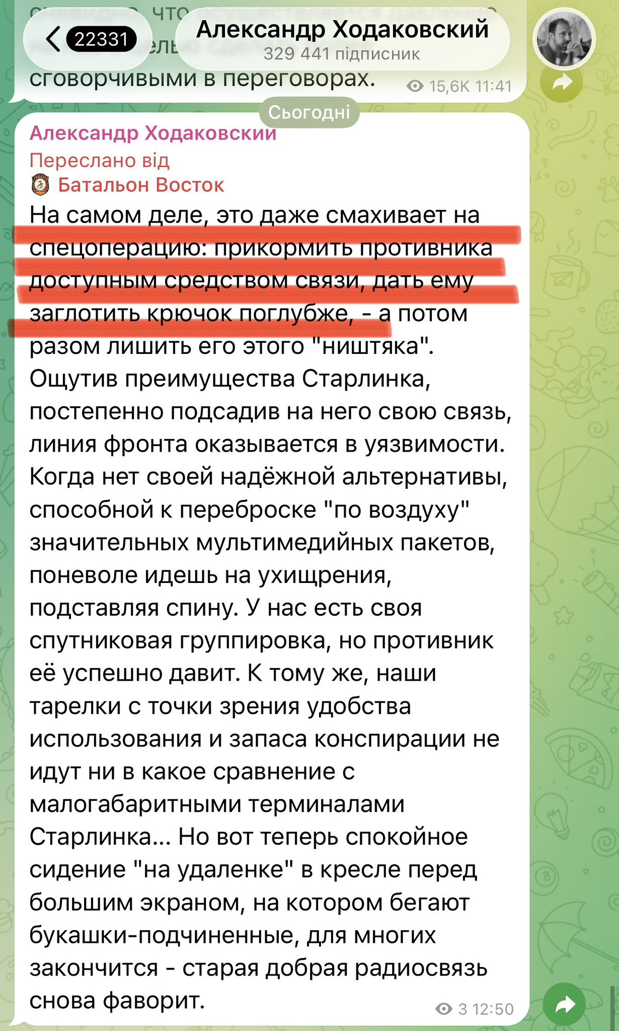 У російських Z-каналах сьогодні справжня істерика. Ілон Маск відключив росіянам старлінки, і раптом зʼясувалося, що у другої армії світу нема свого нормального звʼязку.