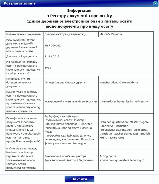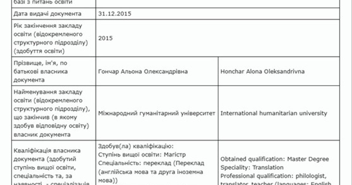 Журналістка Катерина Соляр перерахувала факти, достовірно відомі про Олену Алієву: дівчина закінчила Міжнародний гуманітарний інститут в Одесі, отримала червоний диплом лінгвіста, володіє французькою та англійською мовами. Все це легко перевірити у відкритому реєстрі документів про освіту. Заміжжя за Гейдаром Алієвим та двоє дітей – теж загальновідомий факт.