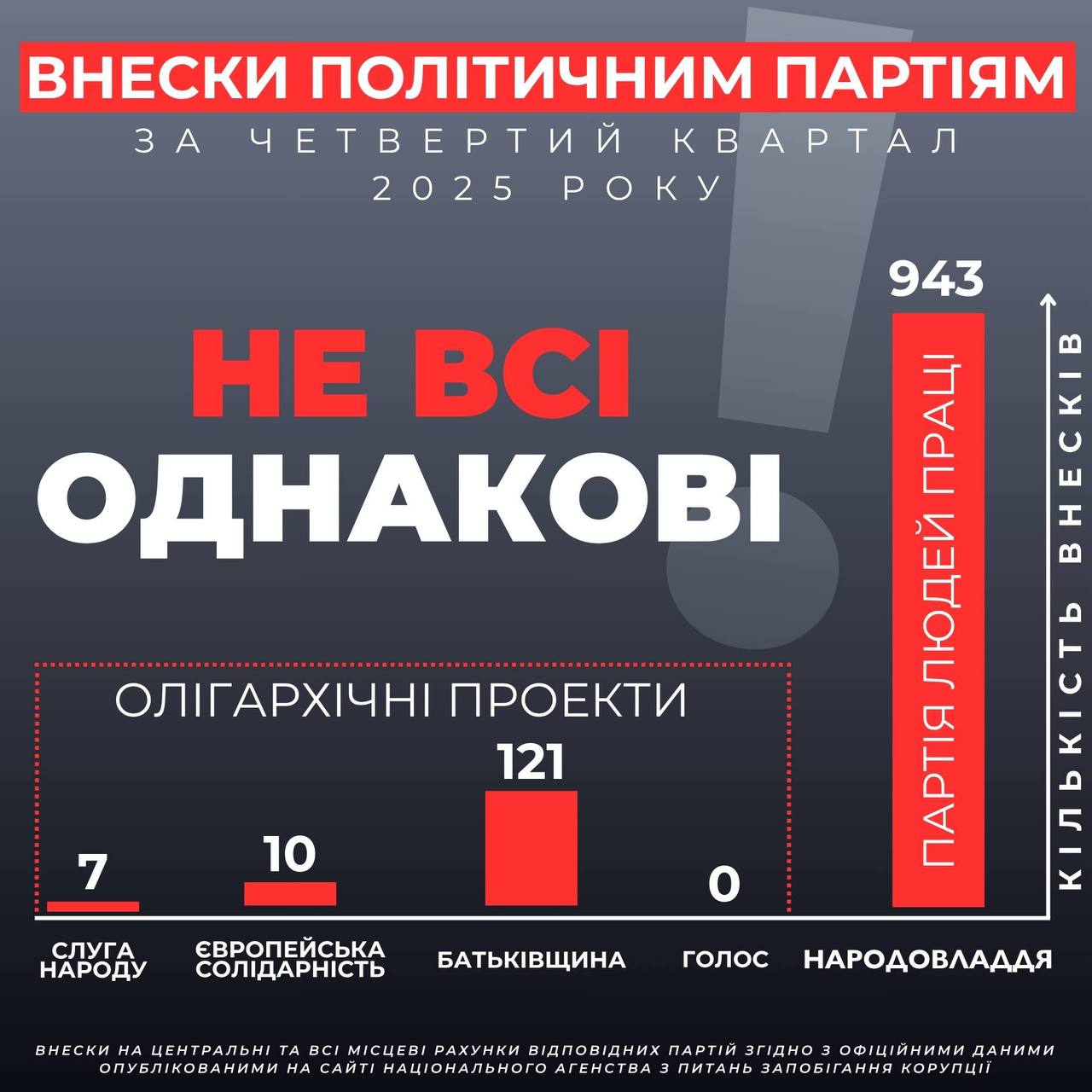 Тому проаналізуйте уважно, будь ласка, статистику щодо загальної кількості внесків за четвертий квартал 2025 року на центральні та всі місцеві рахунки всіх парламентських "партій" та однієї поки що позапарламентської партії: