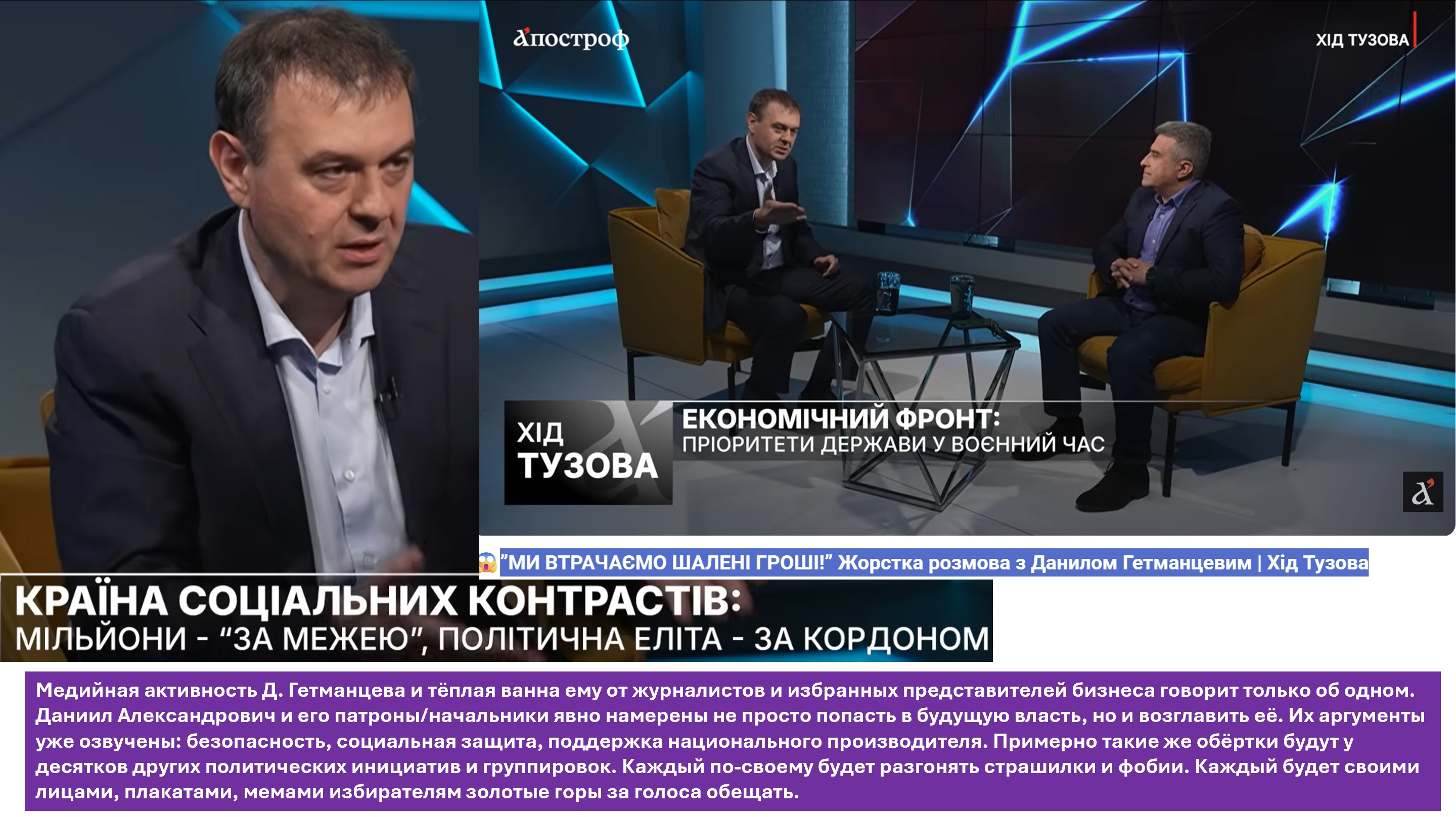 21 апреля 2026г. известный журналист Дмитро Тузов взял интервью у Д. Гетманцева. Обещал жёсткий разговор. Получилась размазня. Д. Гетманцев надел одежды борца за справедливость, против коррупционеров, за армию и оборону страны. Он выступает за защиту бедных так, чтобы забирать у богатых. Он клеймит своих коллег по парламенту, жёстко критикует министров, которые не вписываются в его парадигму и круг его начальником. Он демонстративно ставит интересы своей внутренней клановой тусовки выше целей и задач Правительства, выше единства общества, бизнеса и власти. Срач, панч, клинч, китч, грязь и балаган – его любимая среда, особенно когда в руках власть, а за плечами высокая крыша начальства. Чтобы обнажить нутро, суть политического, властного феномена «Гетманцев» мало быть просто журналистом на общие политические темы. Нужно знать хотя бы основы экономики, статистку, макроэкономический контекст, а также иметь анализ обещаний власти и фактическое их исполнение. К сожалению, такого рода «прожарку» никто Д. Гетманцеву не делал. Он сам тщательно подбирает себе публичных оппонентов, формат дискуссии, чтобы в очередной раз продемонстрировать свои манипулятивные техники.