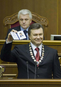 Свидетельство о вступлении на пост Президента ему вручил глава Конституционного Суда Андрей Стрижак на торжественном заседании Верховной Рады.Перед этим Янукович принес присягу на Пересопницком Евангелие и скрепил ее своей подписью.