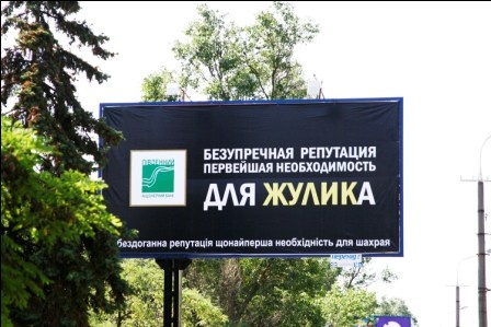 Вчера в ряде городов Украины появились биллборды и плакаты с интересным содержанием – "Безупречная репутация – первейшая необходимость для жулика" и логотипом банка "Пивденный" на черном фоне.