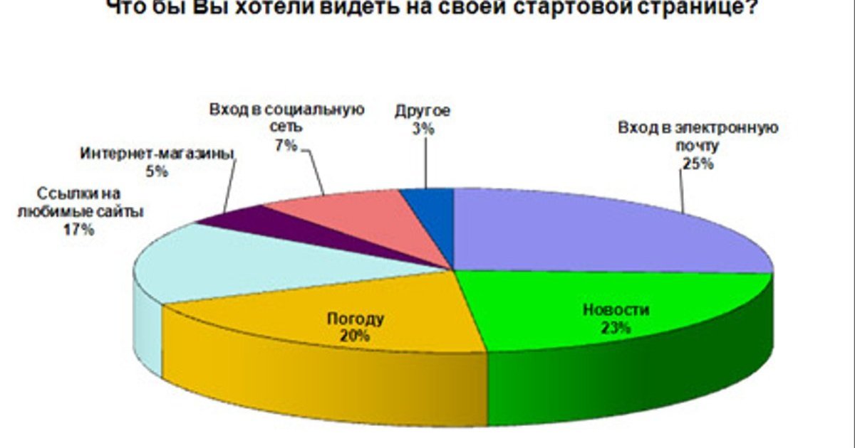 По данным опроса, четверть Интернет-пользователей хотели бы видеть на своей стартовой странице электронную почту, 23% - новости, 20% - прогноз погоды, 17% - ссылки на любимые сайты, 7% - вход в социальную сеть, 5% - Интернет-магазины, 3% - другие сервисы.