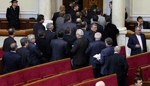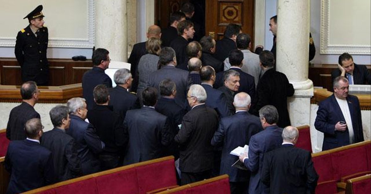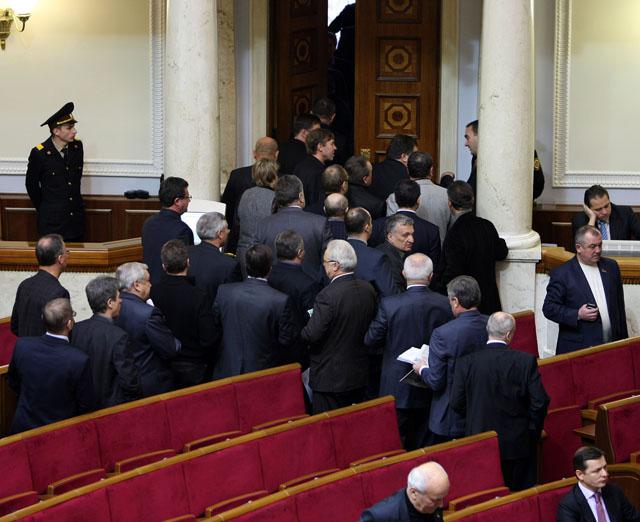 Депутаты от БЮТ перед выступлением представителя Партии регионов скандировали "Ганьба".Так во время утреннего заседания, когда спикер парламента Владимир Литвин дал слово лидеру фракции партии регионов Александру Ефремову.После выступления Ефремова, в знак протеста против действий Партии регионов, Наша Украина и БЮТ покинули зал заседаний