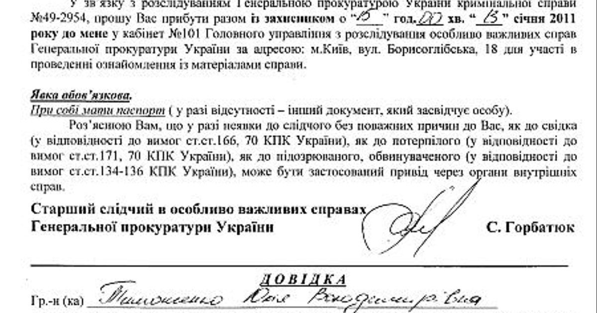 В подтверждение своих слов Сорока передала "Украинской правде" копию повестки следователя ГПУ, в которой указано, что Тимошенко вызывают на 15 часов четверга.