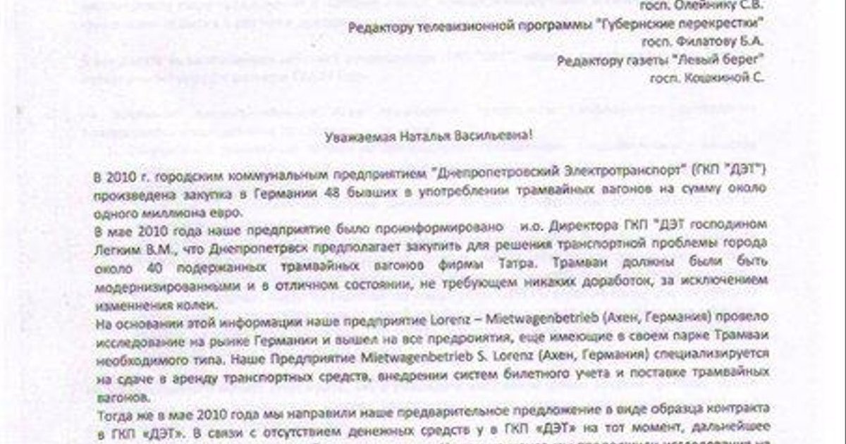 Руководство предприятия «AUTOVERMIETUNG LORENZ» (Ахен, Германия) обратилось к прокурору Днепропетровской области Наталье Марчук с просьбой проверить законность закупки б/у трамваев предприятием «Днепропетровский Электротранспорт».