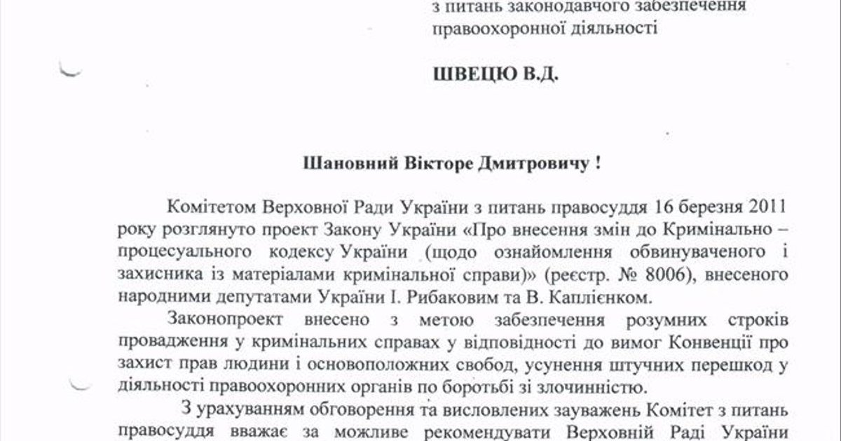 Народный депутат, лидер партии «Україна Майбутнього» Святослав Олейник обратился к президенту Виктору Януковичу с предложением наложить вето на закон «О внесении изменений в Уголовно-процессуальный кодекс Украины относительно ознакомления обвиняемого и защитника с материалами уголовного дела» как существенно сужающий права обвиняемого и его защитника в уголовном процессе.
