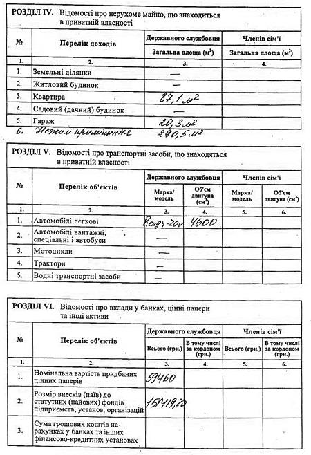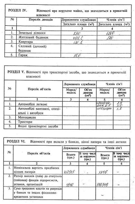 Номинальная стоимость приобретенных депутатом ценных бумаг составляет 417,9 тысяч гривен, размер взносов в уставные фонды - 9,9 тысяч. У членов его семьи соответственно 3,3 и 549,3 тысяч гривен.У депутата нет автомобиля, у членов его семьи - Mitsubishi (объем двигателя 2,4), BMW X-5 (3,0) и автобус Volkswagen (1,8).