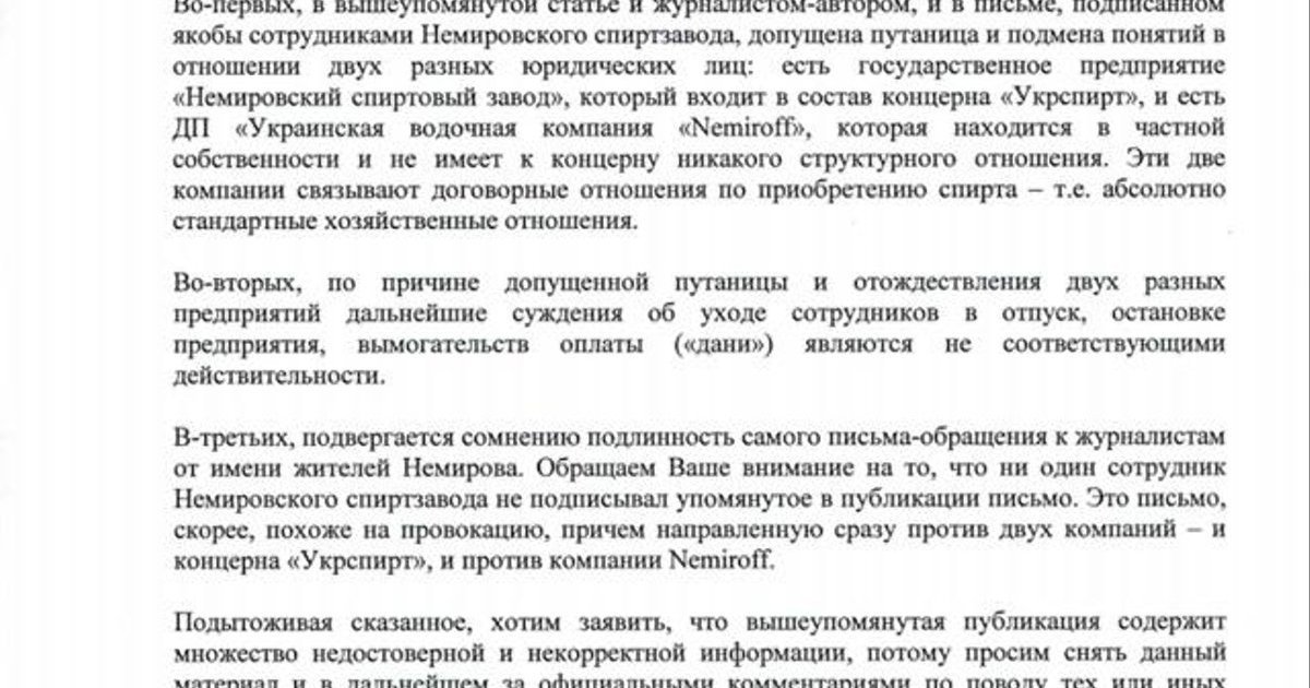 Ознакомившись же с официальным письмом руководства Немировского спиртзавода и его сотрудников, упомянутых в материале, становится понятно, что данные вовсе некорректны.