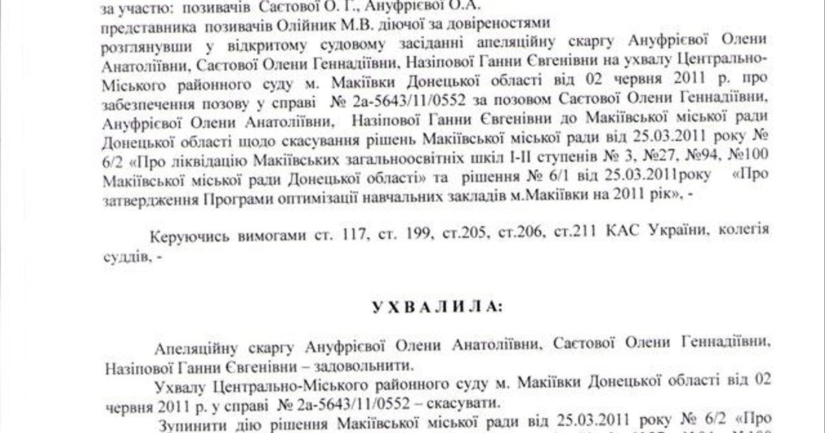 В частности, апелляционный суд отменил постановление Центрально-Городского районного суда Макеевки от 2 июня 2011 года, которым была отменена приостановка решения Макеевского горсовета от 25 марта 2011 года о ликвидации трех украиноязычных школ № 3, 27, 100.