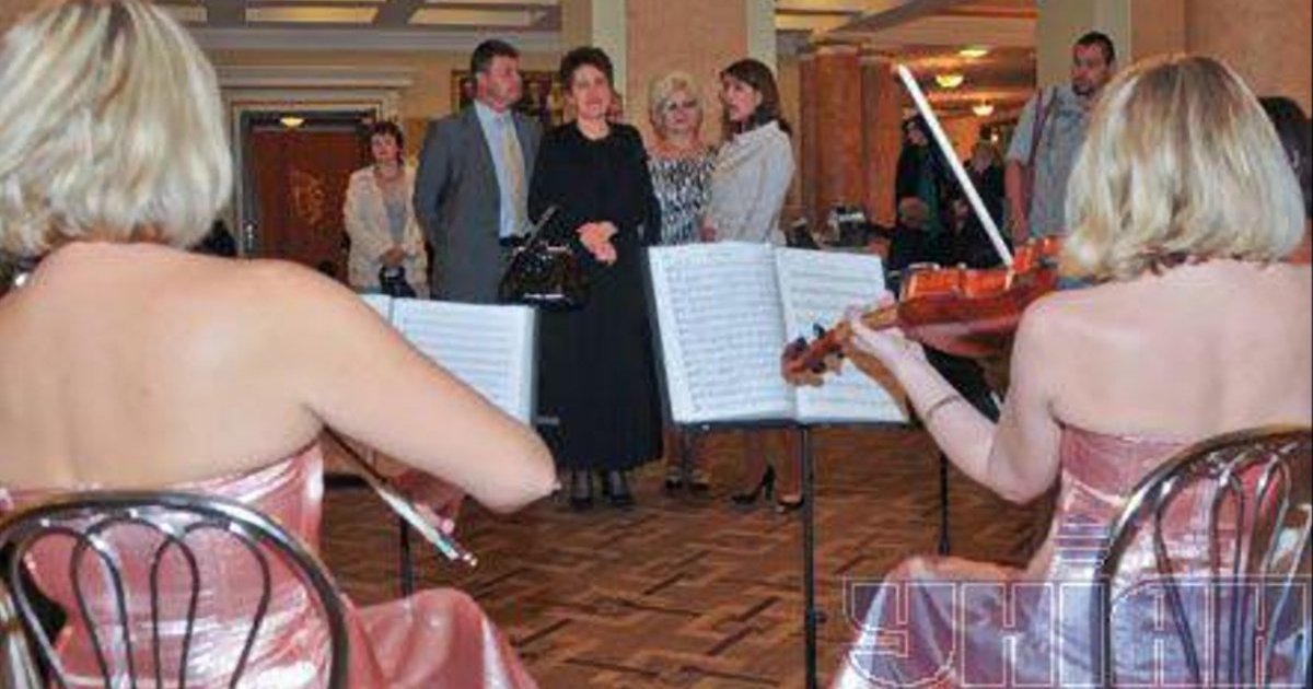 Жена Президента Украины Людмила Янукович слушает выступление музыкантов в фойе Донецкого академического украинского музыкально-драматичного театра перед началом премьеры мюзикла ”Леонардо. Любовь, которой не было”.