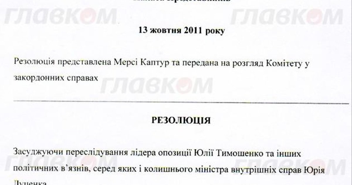В преамбуле документа экс-премьер Юлия Тимошенко, а также бывший глава МВД Юрий Луценко признаются политическими узниками, и палата представителей осуждает их преследование. При принятии резолюции конгрессмены учтут, что судебные процессы над Тимошенко и Луценко "были восприняты международным сообществом как политическое преследование оппозиции Виктором Януковичем".