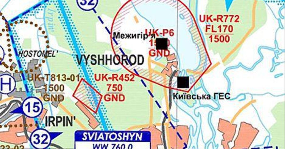 При этом из авианавигационной карты видно, что в центре зоны, запрещенной для полетов, находится отнюдь не Киевская ГЭС, а резиденция «Межгорье».