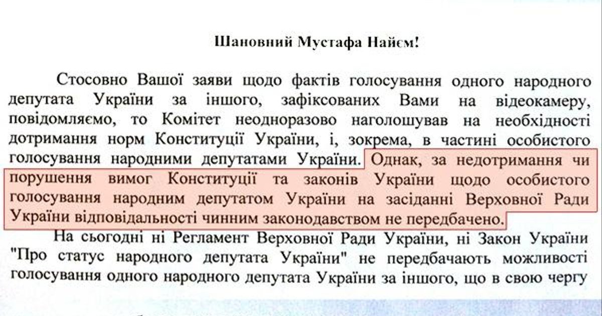 «В ноябре я направил Виктору Пшонке (генпрокурору Украины, – ред.) заявление о преступлении касательно неперсонального голосования народных депутатов. В ответе мне указали, что «контрольные функции за соблюдением Регламента и парламентских процедур возложено на парламентский Комитет Верховной Рады по вопросам Регламента». Немного позже Регламентный комитет, куда я обратился с аналогичным запросом совершенно логично ответил, что ни Конституция, ни законы Украины «не уполномочивают Комитет осуществлять контроль за деятельностью народных депутатов Украины и давать оценку их действиям», – написал журналист Мустафа Найем в своем блоге, сообщает «Цензор.НЕТ».