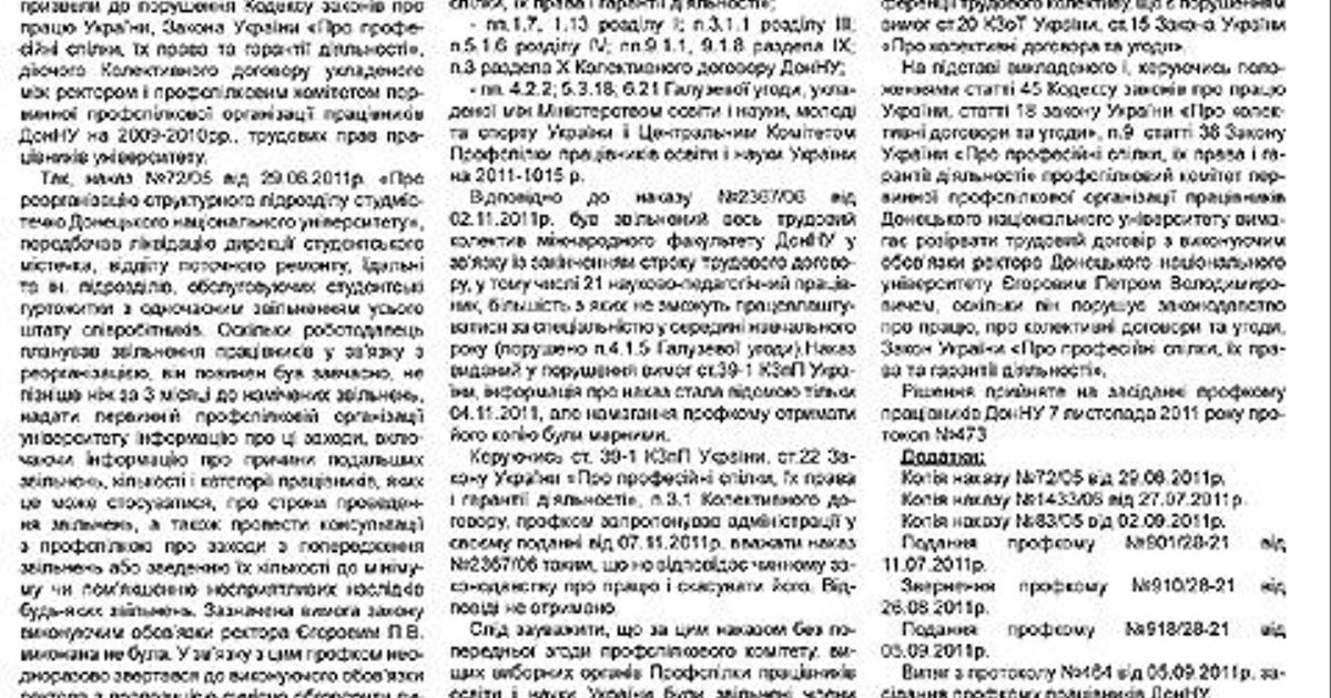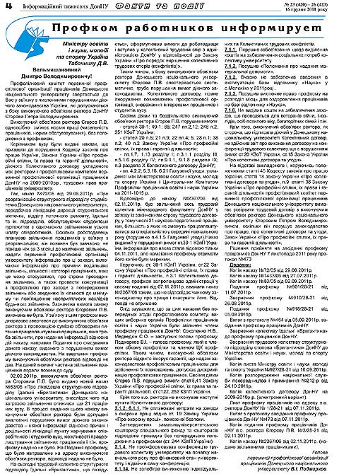 «Им дали понять, что несогласие с и.о. ректора может стоить им рабочего места. Все понятно – люди боятся потерять работу. Я не помню, чтобы раньше у нас в университете за какие-то высказывания людям предлагали уйти. Но сейчас именно такая ситуация складывается. Есть такие случаи», — резюмировал В.Подмарков. Напомним, 10 декабря 2010 года конференция трудового коллектива ДонНУ избрала претендентом на пост ректора Юрия Лысенко, который победил на выборах протеже МОН, и.о. ректора Петра Егорова. Однако правомерность назначения нового ректора оспорил в судепреподаватель Киевского национального университета МВД Александр Корыстин, который заявил, что тоже подавал документы на участие в конкурсе на этот пост, но не был включен в список претендентов.