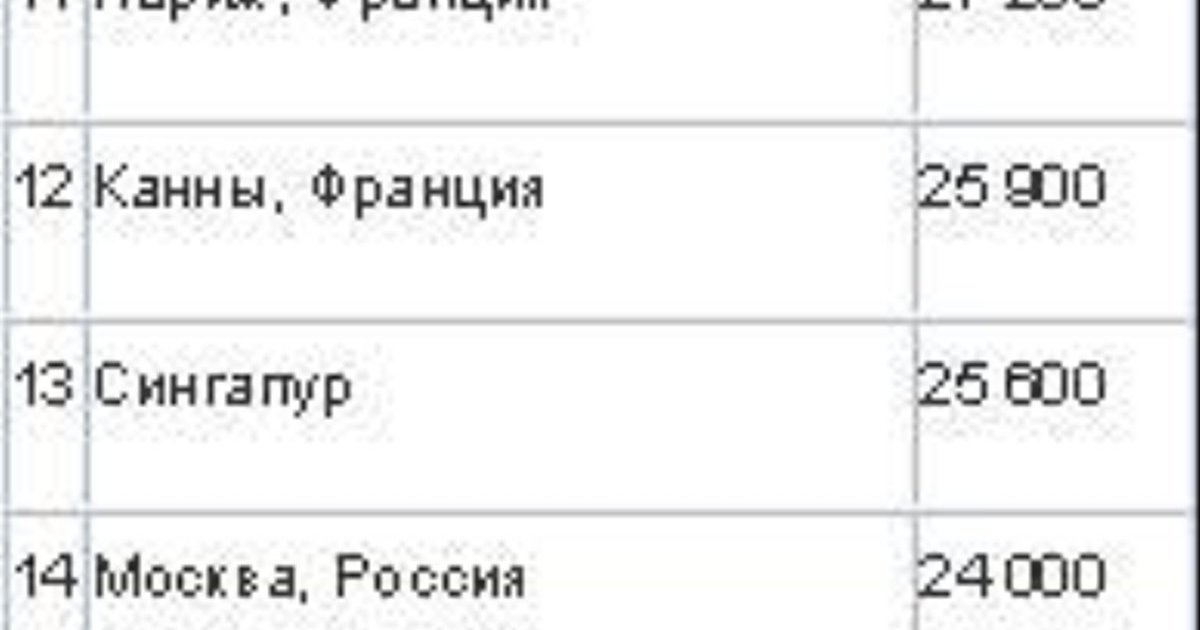 В сравнении с участниками рейтинга, Киев - город дешевых квартир. Один квадрат на вторичном рынке здесь стоит в среднем $2138. Недвижимость на юге Франции, в Кап-Ферра, подешевела на 5% по сравнению с 2010 годом - до 51 800 долл./кв.м. Только в двух городах цены на недвижимость выросли за последние 12 месяцев - в Лондоне и Цюрихе. Города с самыми высокими в мире ценами на недвижимость: