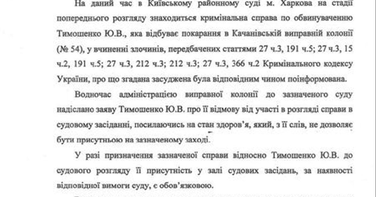 "... Обращаемся к Вам с просьбой дать заключение о возможности в дальнейшем доставки осужденным Тимошенко Ю.В. из исправительной колонии в зал судебных заседаний и, соответственно, ее участия в судебном процессе по медицинским показаниям", - говорится в заявлении.