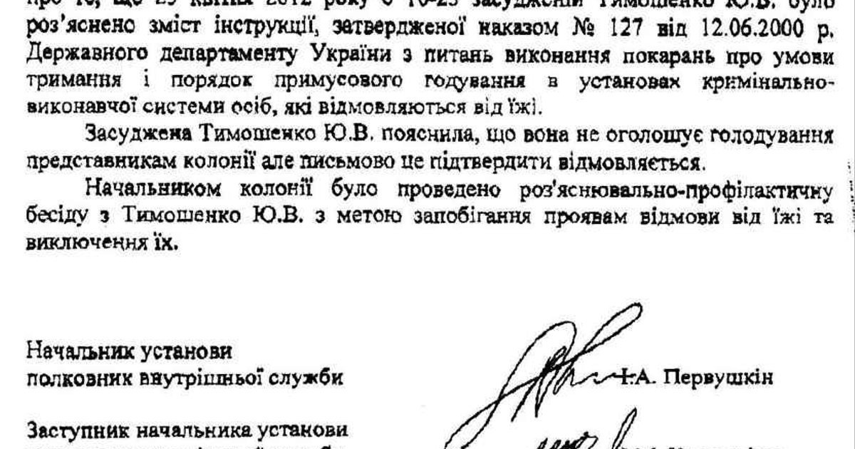Начальник колонии провел с Юлией Тимошенко разъяснительную работу с целью предотвращения проявлений отказа от еды и исключения ее.