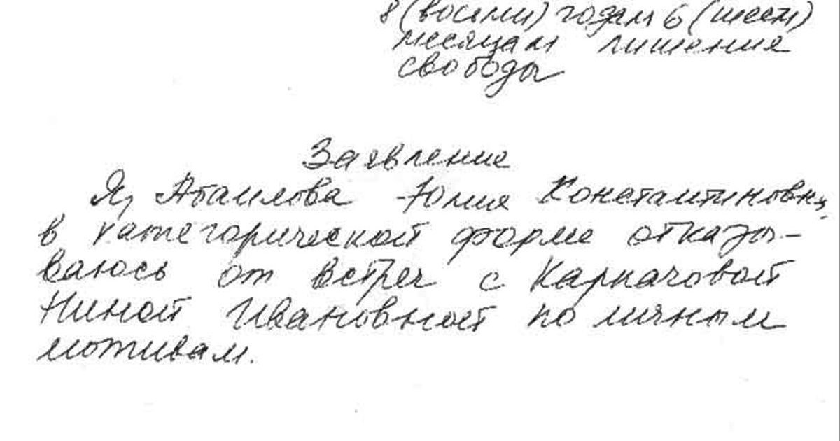 «Встречаться с Н.Карпачевой осужденная категорически отказалась, о чем подала руководству учреждения письменное заявление», - сообщает пресс-служба ГПтСУ и приводит текст заявления Ю.Абапловой.