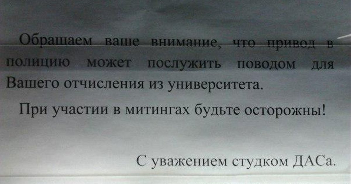 В объявлении сообщается, что привод в полицию может послужить поводом для отчисления из МГУ, в следствие чего студентов просят «быть осторожными» при участии в митингах. Послание подписано студенческим комитетом ДАСа.