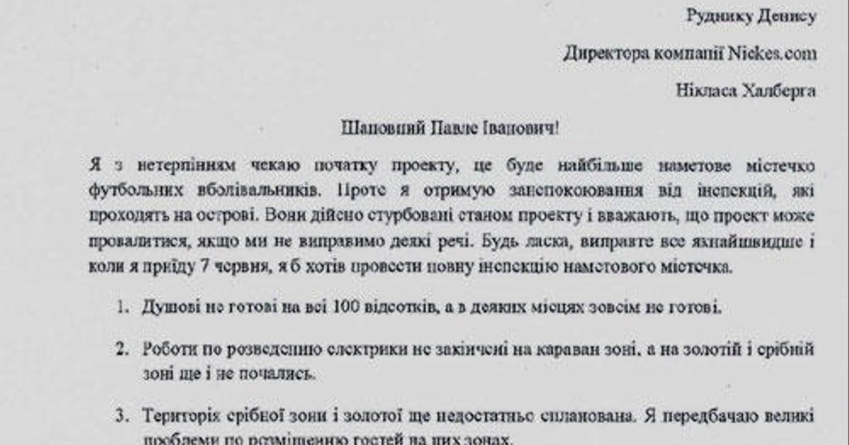 Об этом идет речь в письме директора компании Nikes.com Никласа Халберга начальнику КП "Плесо", сообщает Цензор.НЕТ со ссылкой на "Украинскую правду. Киев". Директор компании, которая заключила соглашение с КП "Плесо" на обустройство кемпинга на Трухановом острове обеспокоен тем, что за два дня до поселения шведских фанов кемпинг совсем не готов. "Пожалуйста, уточните все быстрее, и когда я приеду 7 июня, я бы хотел провести полную инспекцию палаточного городка", написал Халберг в письме. Замечания у него вызвали душевые, электричество, планировка территории и траншеи по всему острову. Вместе с тем, Санстанция Киева не рекомендует размещать фанов на Трухановом острове, поскольку тамошние условия не соответствуют санитарным нормам.