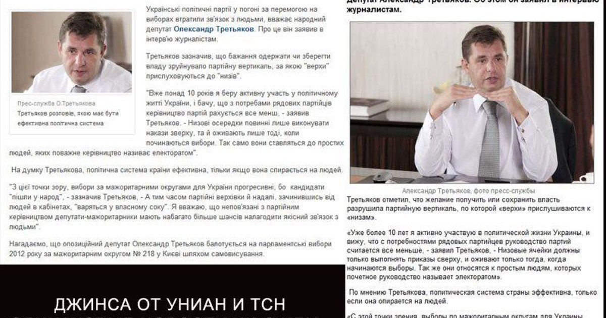 "Оказывается, "джинса" Третьякова идет сквозной через весь медиа-холдинг Коломойского. Сегодня одинаковые новости ни о чем - без пометки "реклама" - публикует УНИАН и ТСН. Недавно этим же занимались УНИАН и "Комсомольская правда". А еще недавно Третьяков рассказывал в кулуарах Рады, что устал от парламента и не видит смысла в депутатстве. Теперь, видно, все поменялось. Ждем новой "джинсы" от Третьякова на УНИАН, ТСН и в Комсомолке", - написал журналист.