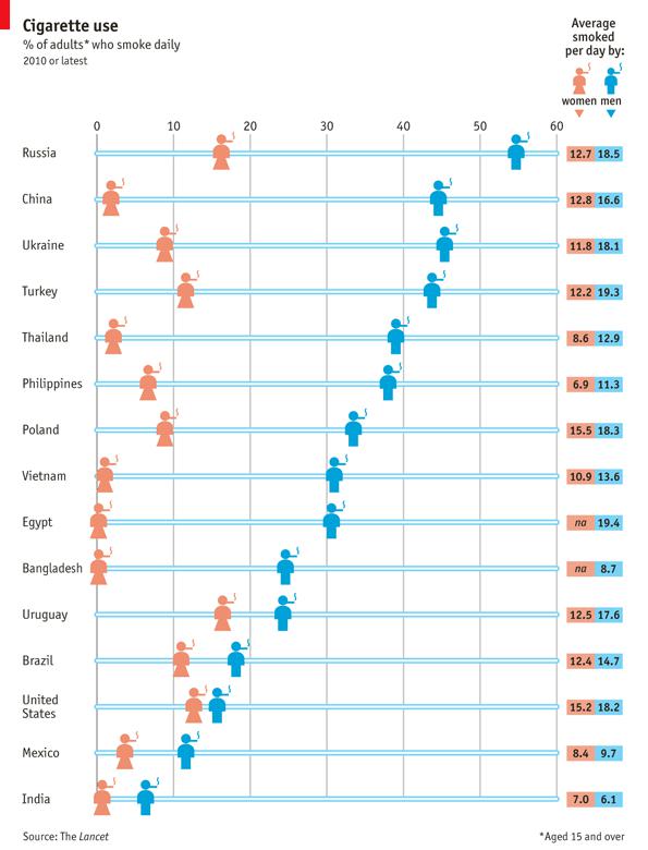 Как сообщает «Цензор.НЕТ» со ссылкой на «dirty.ru», одно из ведущих медицинских изданий «The Lancet» провело исследование по количеству курильщиков среди стран с низким и средним уровнем дохода. В список вошли: Бангладеш, Бразилия, Китай, Египет, Индия, Мексика, Филиппины, Польша, Россия, Таиланд, Турция, Украина, Уругвай и Вьетнам. Опрос проводился с 1 октября 2008 по 15 марта 2010 года. Опрашиваемые - лица от 15 лет и старше. Исследование проводилось с целью узнать количество, пол, возраст курильщиков, доступность табака и сигарет. И установить эпидемиологический риск возникновения респираторных заболеваний у граждан этих стран.