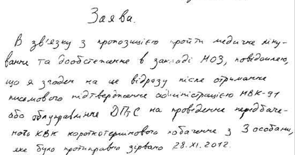 «В этом заявлении он прибегает к шантажу руководства колонии, обещая выехать в больницу только в случае получения разрешения на проведение краткосрочного свидания», - сообщает ГПтС.