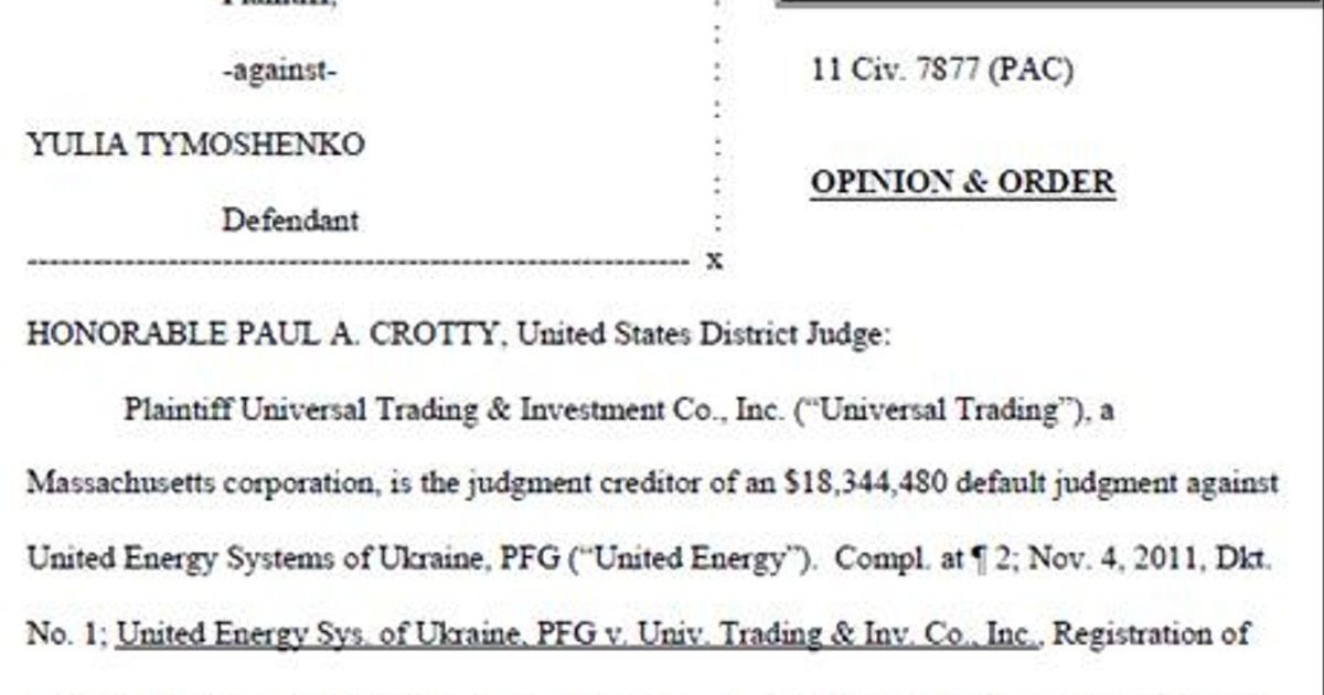 В конце 2005 года в связи с размораживанием заблокированных ранее активов ЕЭСУ UTICo предприняла несколько попыток взыскать присужденную сумму с компании и отдельных лиц, близких к Тимошенко, в частности, с ее бизнес-партнера Павла Лазаренко, но безрезультатно. UTICo, зарегистрированная в штате Массачусетс, подала иск к Тимошенко после того, как компании было отказано в привлечении ее в качестве третьего лица, заявляющего собственные требования, к спору между украинским экс-премьером, швейцарским трейдером "РосУкрЭнерго" (RUE) и одним из его владельцев Дмитрием Фирташем. Суд также принял решение закрыть это производство. Защита Тимошенко просила суд отклонить иска Universal Trading & Investment Co. Inc по причине юрисдикции, а также невозможности Тимошенко принимать заочное участие в суде из-за ее ухудшившегося состояния здоровья. Ранее Цензор.НЕТ сообщал, что истец против Тимошенко официально сотрудничает с Пшонкой.