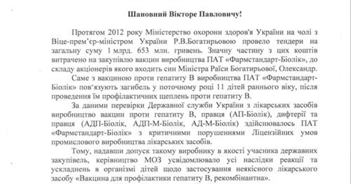 Именно с вакциной производства ПАО «Фармстандарт-Биолик» связывают гибель в текущем году 11 детей разного возраста после проведения им профилактических прививок против гепатита В. Об этом говорится в обращении народного депутата Украины Андрея Сенченко к Генеральному прокурору Виктору Пшонке.