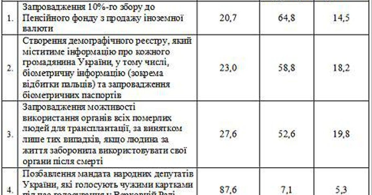 В частности, две трети населения Украины (64,8%) не поддерживают введение 10%-го сбора в Пенсионный фонд с продажи иностранной валюты. Поддерживают такую инициативу втрое меньше респондентов - 20,7%. Не определились - 14,5% опрошенных. Создание демографического реестра, содержащего информацию о каждом гражданине Украины, в том числе, биометрическую информацию (в частности отпечатки пальцев) и введение биометрических паспортов поддерживают меньше четверти опрошенных (23,0%), не поддерживают - больше половины (58,8%). Не определились - 18,2% опрошенных.