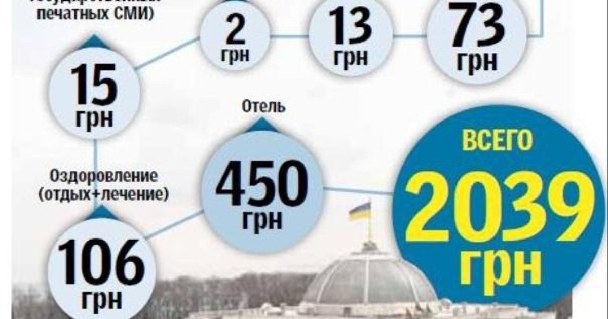 Издание подсчитало, что один депутат обходится госказне в 2039 грн в день. В эту сумму включены зарплаты нардепов и их помощников, расходы на проезд депутата, в том числе на недешевые перелеты, лечение, путевки в санаторий, телефонную связь, проживание в отеле и даже канцелярские принадлежности. То есть депутату, как минимум, по работе не нужно тратиться ни на бензин, ни на авиабилеты, ни на больницы, ни на беседы по телефону, ни даже на ручки с блокнотами. Для сравнения: такую же зарплату (но в месяц) получает врач-участковый (с нее же он платит за жилье, проезд и т.п.).