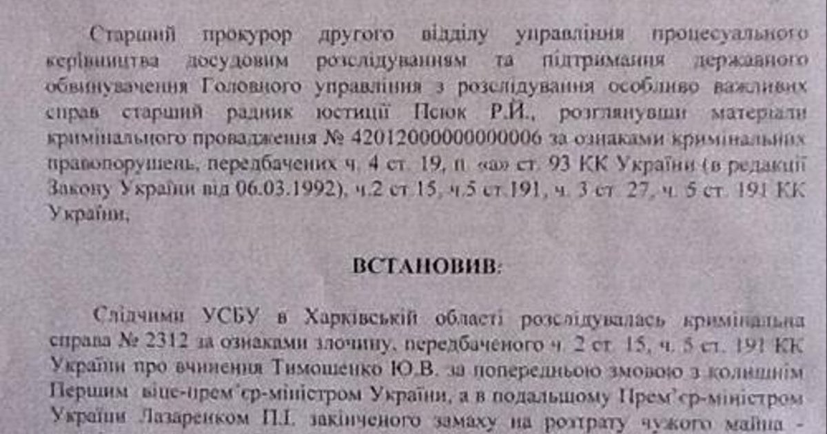 Генпрокуратура сообщает, что 17 января было вынесено постановление о закрытии уголовного дела о покушении экс-премьера Юлии Тимошенко и Павла Лазаренко на растрату чужого имущества в особо крупных размерах (на сумму более 3 млрд. грн.). В рамках следствия по этому эпизоду следователи получили доказательства, указывающие на совершение не покушения, а именно организации растраты этого имущества.