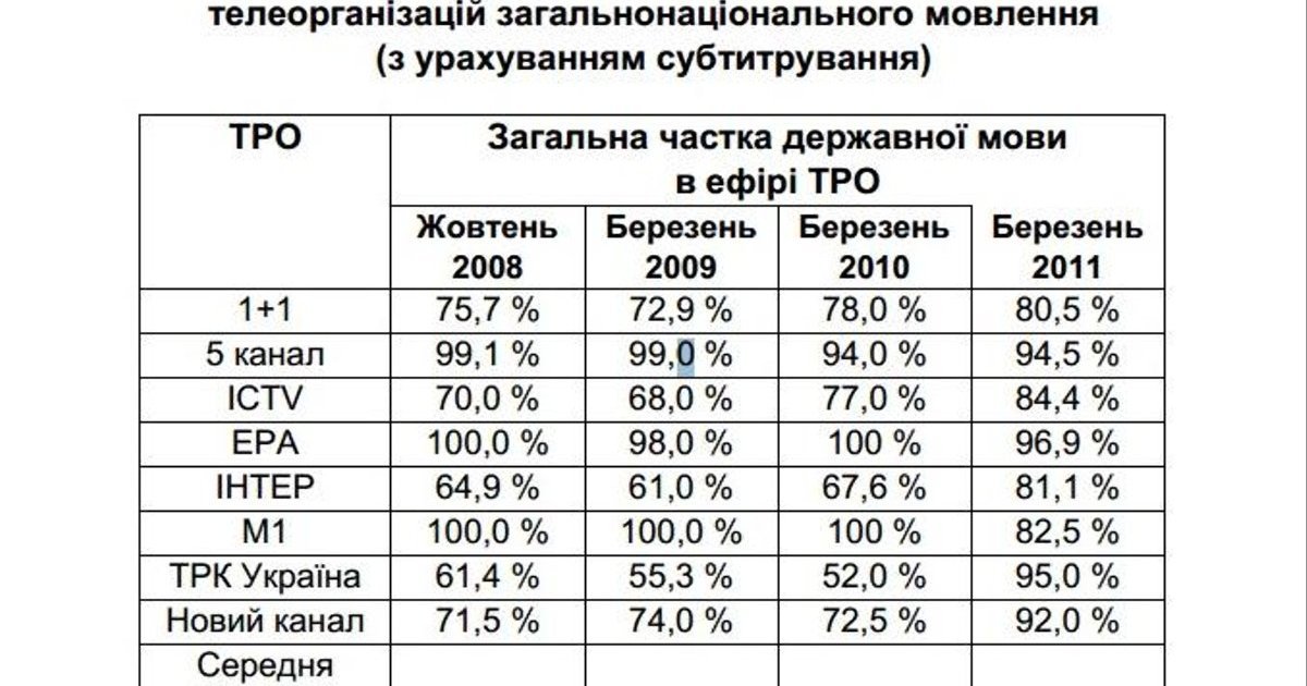 В 2011 году объем вещания на государственном языке на общенациональных телеканалах Украины вырос по сравнению с предыдущими годами.