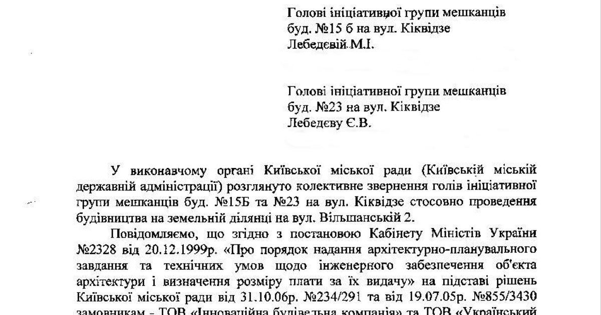 По сегодняшний день городские власти Киева не знают, получил ли застройщик у Государственной архитектурно-строительной инспекции Украины разрешение на строительство. «Информация о разрешении на выполнение строительных работ по объекту от Инспекции не поступала,» - подчеркивается в письме.