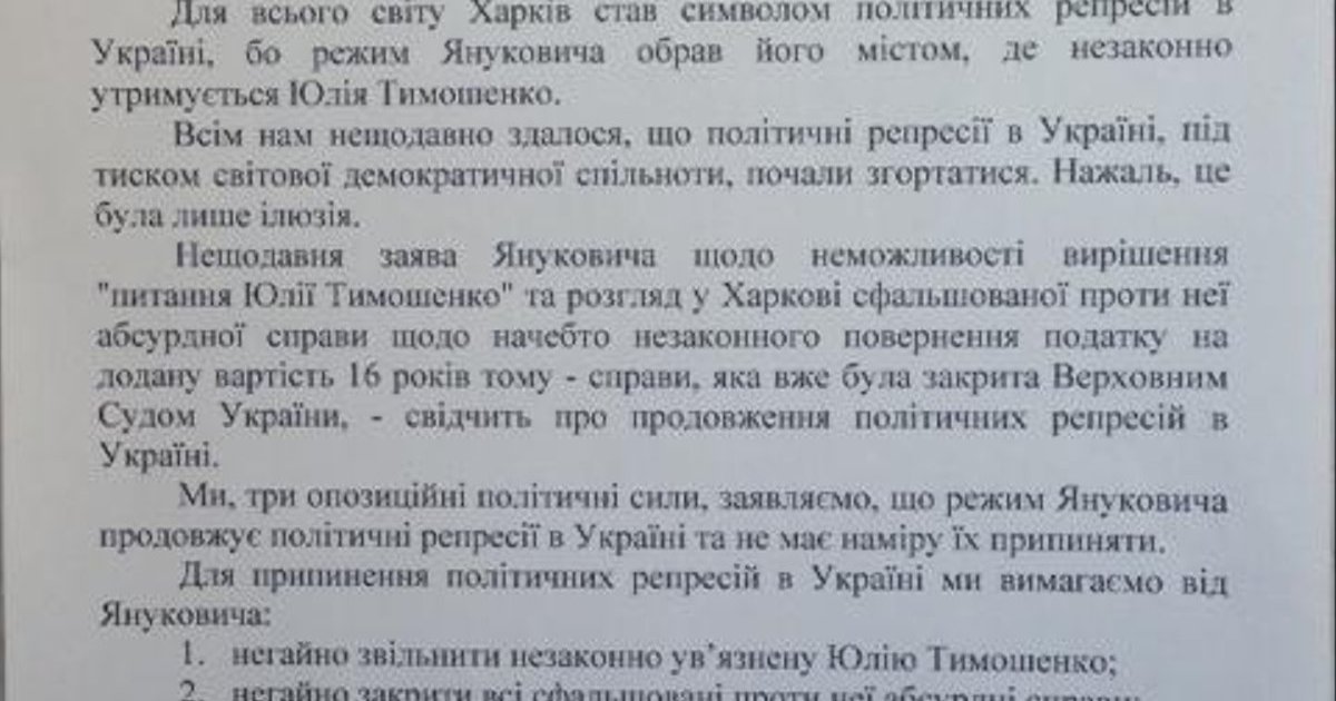 В своем обращении оппозиционеры требуют от Януковича немедленно освободить незаконно заключенную Юлию Тимошенко, закрыть все сфальсифицированные против нее дела, обеспечить ей полную политическую и юридическую реабилитацию и предоставить ей возможность участвовать в выборах.