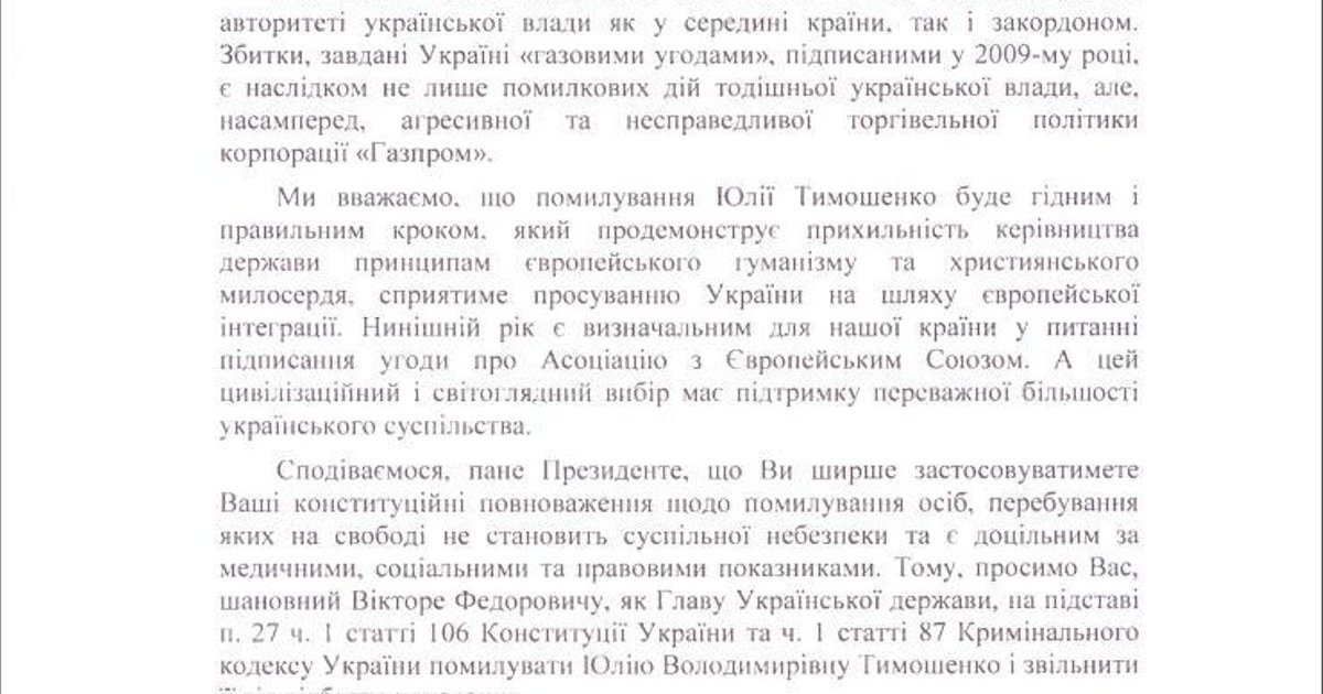 Брюховецкий, Лукьяненко и Бондарчук выразили надежду, что президент шире применит свои конституционные полномочия по помилованию лиц, пребывание которых на свободе не представляет общественной опасности и целесообразно по медицинским, социальным и правовым показателям. "Поэтому, просим Вас, уважаемый Виктор Федорович, как главу Украинского государства на основании пункта 27 части 1 статьи 106 Конституции Украины и части 1 статьи 87 Уголовного кодекса Украины помиловать Юлию Владимировну Тимошенко и освободить ее от отбывания наказания", - говорится в письме.