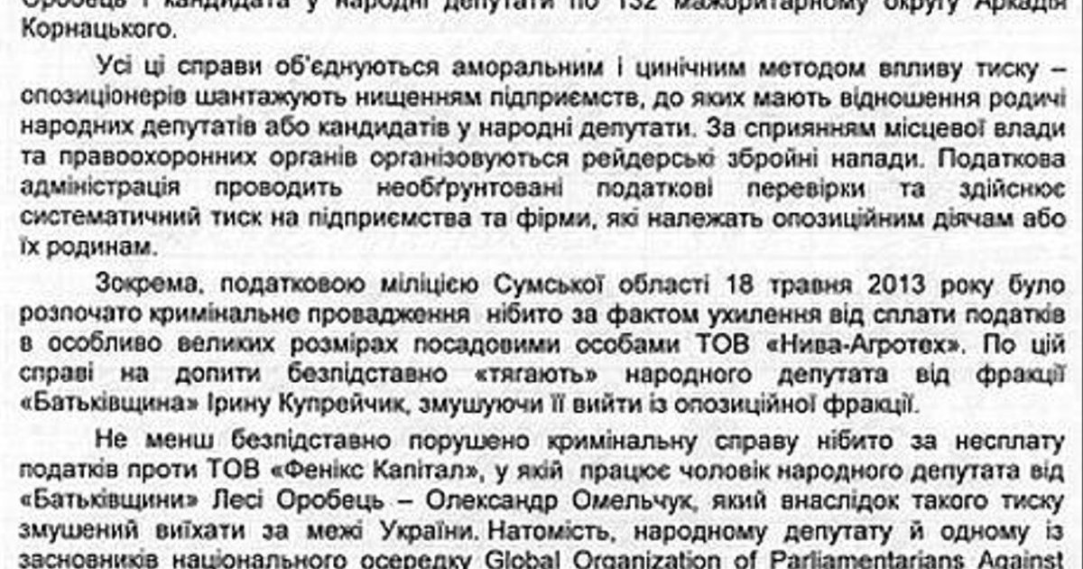 «Арсений Яценюк, Виталий Кличко, Олег Тягнибок и еще более 100 представителей оппозиции в парламенте требуют прекратить преследование оппозиционеров и их семей, а также привлечь виновных к ответственности в соответствии с требованиями закона», - сообщила народный депутат от "Батькивщины" Леся Оробец, передает Цензор.НЕТ со ссылкой на Facebook политика.