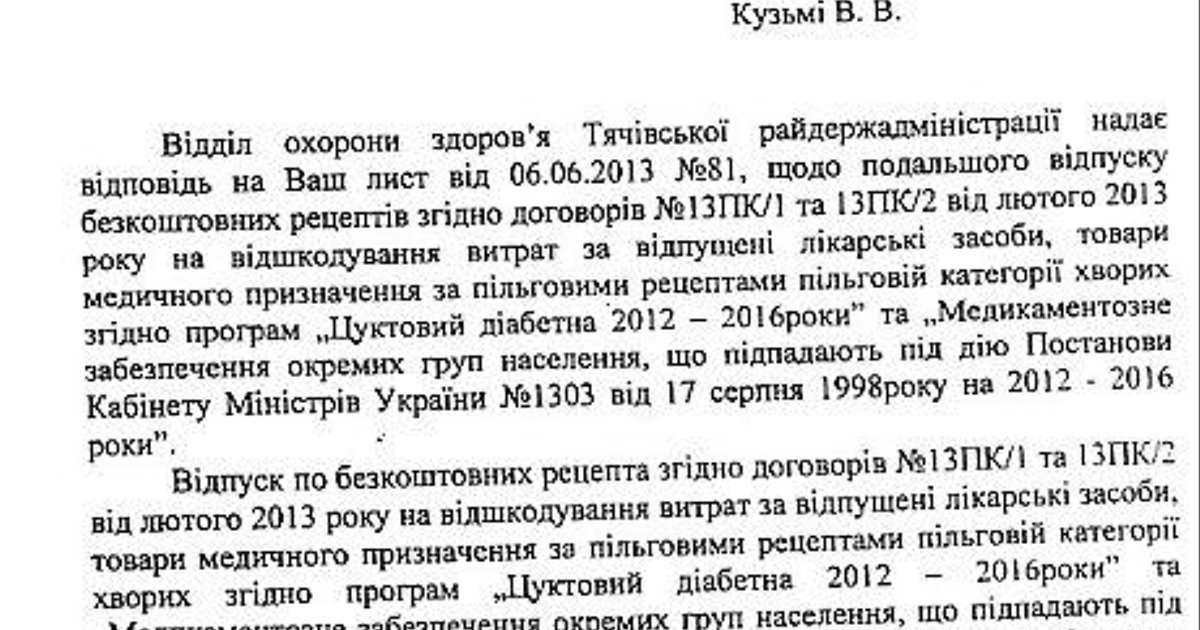 "Из этого письма следует, что Тячевская РГА прекращает действие постановления Кабинета Министров о бесплатном обеспечении льготных категорий, в частности диабетиков, медикаментами", - говорится в материале.